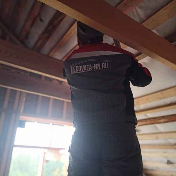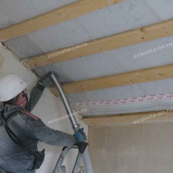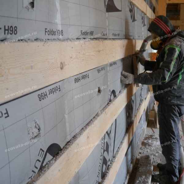 Эковату необходимо монтировать между двумя жесткими элементами. Поэтому при задувке под пленку мы всегда делаем поддерживающую горизонтальную подшивку доской, чтобы со временем пленка не растягивалась и эковата не осыпалась.