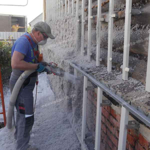 Эковата доставляется на объект в мешках в спрессованном виде. При монтаже эковата засыпается в бункер профессиональной установки, где брикеты разбиваются и вспушиваются ворошилками. Затем материал по шлангам подается в полость под высоким давлением воздуха. Таким образом материал заполняет все свободное пространство.